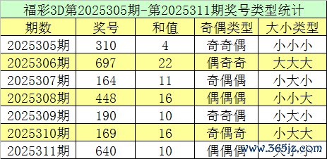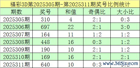 福彩3D第2025311期转头:奖号为640,奖号奇偶比为0:3,大小比为1:2,和值为10,类型为组六。